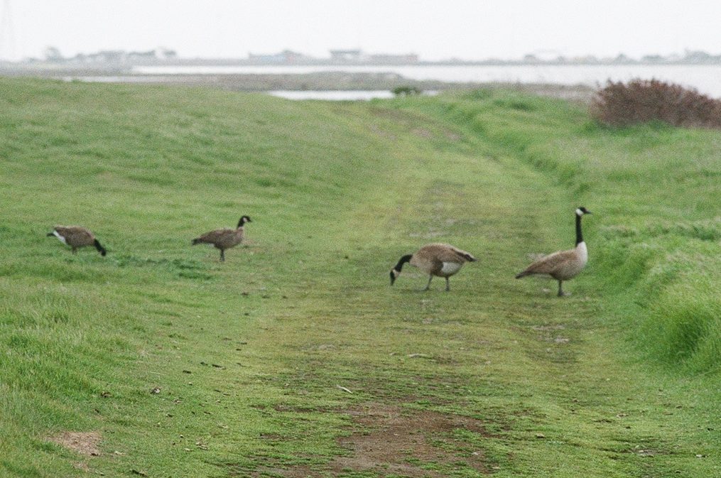 Here is a pic I took a few years ago at Hayward Regional Shoreline on Kodak Gold film of two Canada Geese and two Cackling Geese together. You can clearly see the size difference–the Cackling Goose is micro, no way around it. As the Audubon site says in my favorite quote of all time: “any mini goose warrants further investigation”.