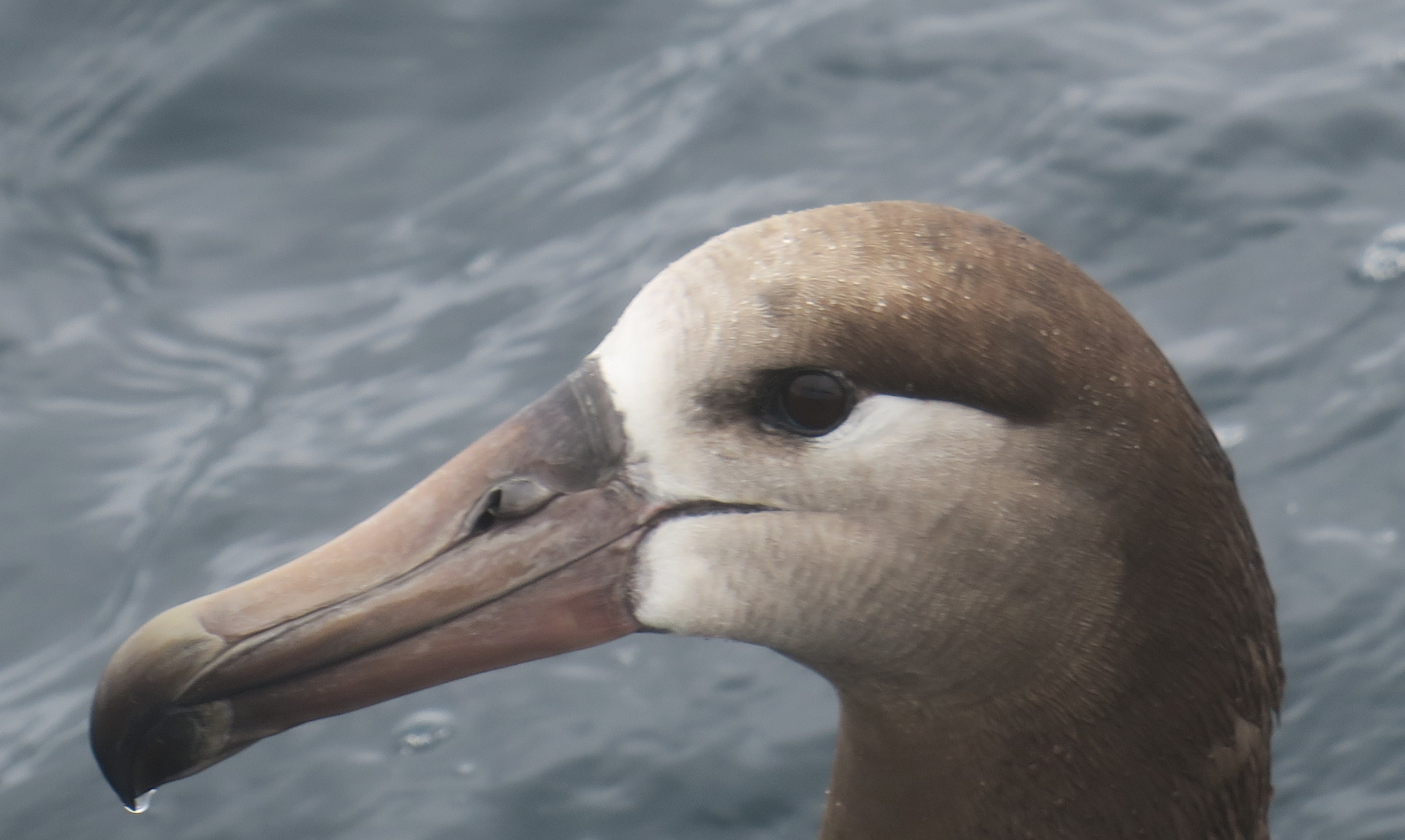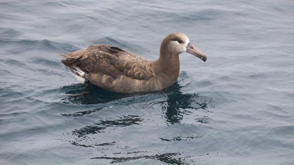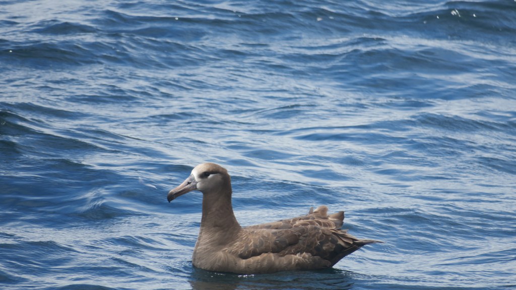 My avian highlight of the trip was seeing a Black-footed Albatross. I saw several on my last outing and was hoping to see more. In total, we saw around 7! They are huge birds with up to seven ft wingspans; their wings are so big they have to origami fold them twice to put them back against their bodies. They spend almost all of their time at sea and have evolved unique abilities to make that kind of lifestyle (pelagiccore) easier. They use very little energy flying with infrequent wing flapping, and are able to drink salt water and smell stuff over great distances thanks to their special tubular noses.